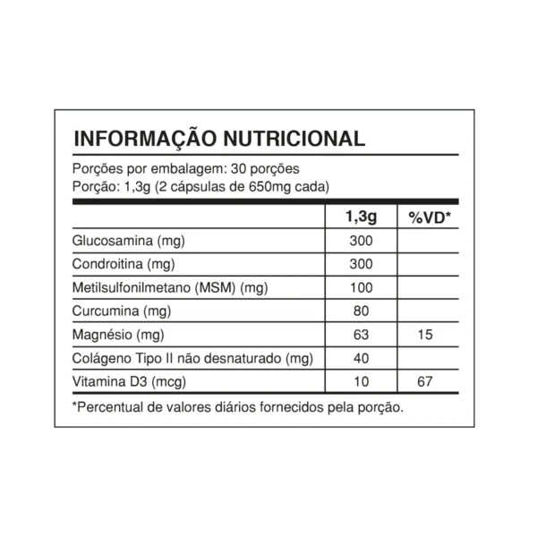 Sulfato de Glucosamina com Cloreto de Potássio, sulfato de Condroitina produzido a partir da fermentação de Escherichia coli, metilsulfonilmetano (MSM), extrato de rizomas de Curcuma longa, colágeno de frango com colágeno tipo II não desnaturado, amido modificado, estabilizante carbonato de cálcio, antiumectantes estearato de magnésio e dióxido de silício. Componentes da cápsula: gelificante gelatina, umectante glicerina e veículo água destilada, corantes dióxido de titânio, amarelo crepúsculo, azorrubina, azul brilhante e amarelo quinoleína.