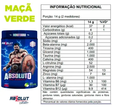 Sabor Maça verde: arginina, maltodextrina, beta alanina, taurina, L-alanina, glicerol,