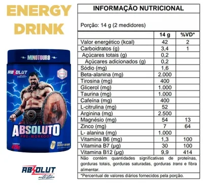 Energy Drink: arginina, maltodextrina, betaalanina, taurina, L-alanina, glicerol, cafeína, L-tirosina, magnésio (Fosfato de Magnésio Dibásico Monohidratado e Óxido de Magnésio), zinco (Óxido de Zinco), vitamina B6 (Piridoxina HCL), L-citrulinilarginina, biotina (vitamina B7), vitamina B12 (Cianocobalamina), aromatizante sintético idêntico ao natural, edulcorante: stevia (glicosídeos de esteviol), acidulante: ácido cítrico, antiumectantes: