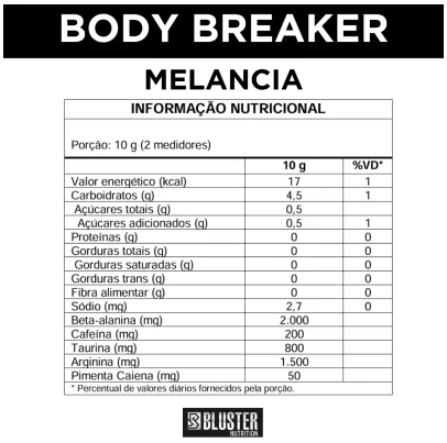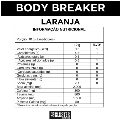 O Body Breaker é o pré-treino definitivo para quem busca potência máxima, foco absoluto e energia explosiva. Com uma fórmula cuidadosamente desenvolvida, ele reúne ingredientes de alta performance para ajudar você a ir além em cada treino. A beta-alanina combate a fadiga muscular, permitindo sessões mais intensas e prolongadas. A cafeína proporciona estímulo imediato, aumentando energia, foco e disposição, além de acelerar o metabolismo. A arginina potencializa a vasodilatação, promovendo o pump muscular e melhorando a circulação sanguínea durante os exercícios. A taurina contribui para o equilíbrio eletrolítico e a recuperação muscular, garantindo força e resistência. Já a pimenta caiena adiciona um toque especial à fórmula, estimulando a termogênese e a queima de gordura, além de melhorar o desempenho físico. Com o Body Breaker, você está pronto para destruir barreiras e conquistar resultados extraordinários. Experimente o pré-treino que transforma treinos intensos em pura evolução!